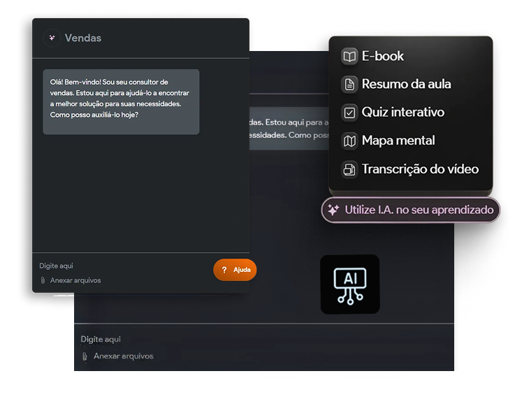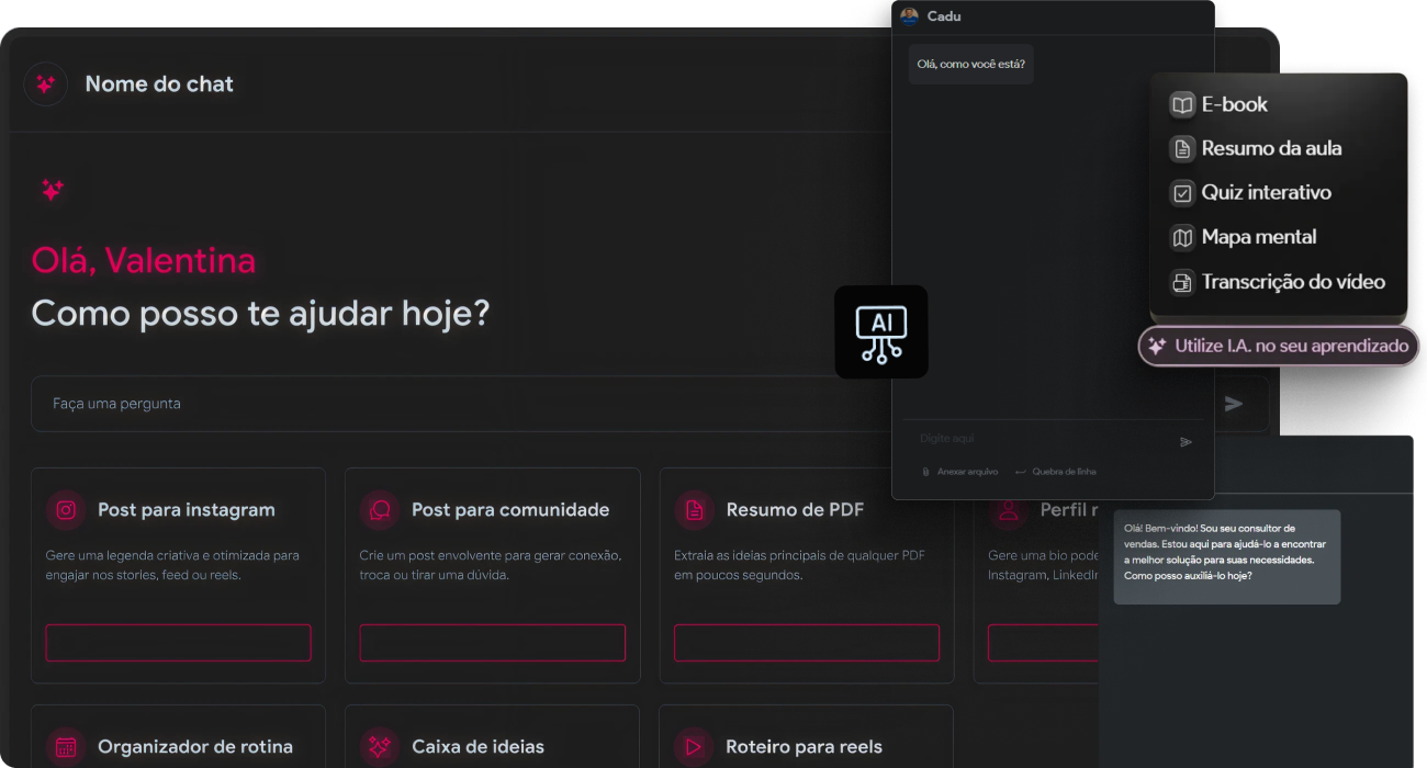 Um assistente inteligente treinado para resolver dúvidas frequentes, orientar alunos e manter o suporte funcionando 24 horas por dia.
