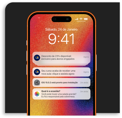 Envie lembretes, avisos e novidades em tempo real, direto na tela do smartphone do seu aluno.
