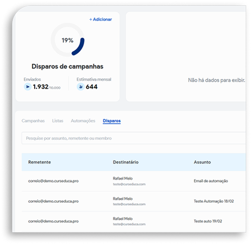Acompanhe todos os e-mails disparados pela sua plataforma, com status, destinatários e métricas de abertura.